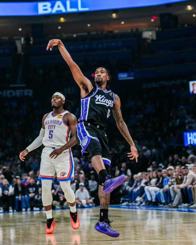 易边再战,2队的状态都有所下滑,连续投篮打铁,进攻都打得不好!亚历山大靠着个人能力,连投带罚不断取分,成功在3节时间里砍下20+,也实现了自己连续77场20+得纪录,不过雷霆的形势却不好,始终被国王队压制,在进入关键时刻时,球队还落后了7分!可就在国王问问占据着优势时,球队却突然进攻失灵,连续进攻打铁,雷霆也是丝毫没有客气,轰出一波11:0的进攻波,一举反超比分!拉文罚球为国王止血,但雷霆并没有给国王翻盘的机会,最终107:101拿下国王,豪取5连胜!